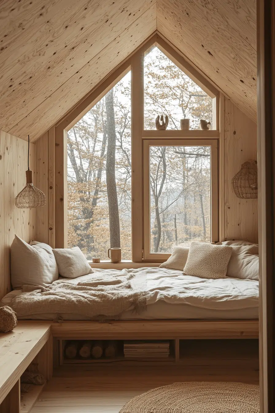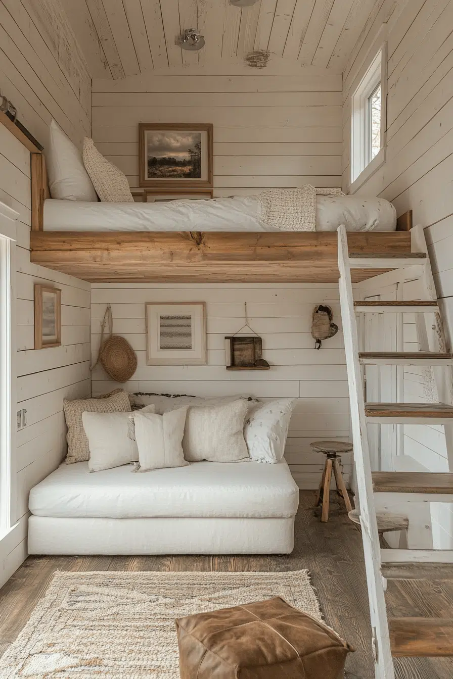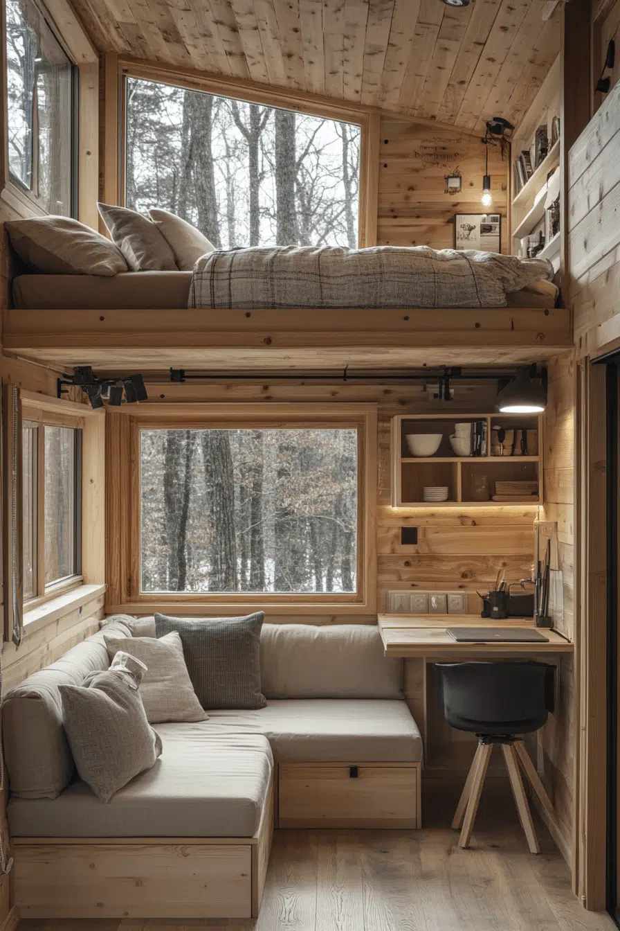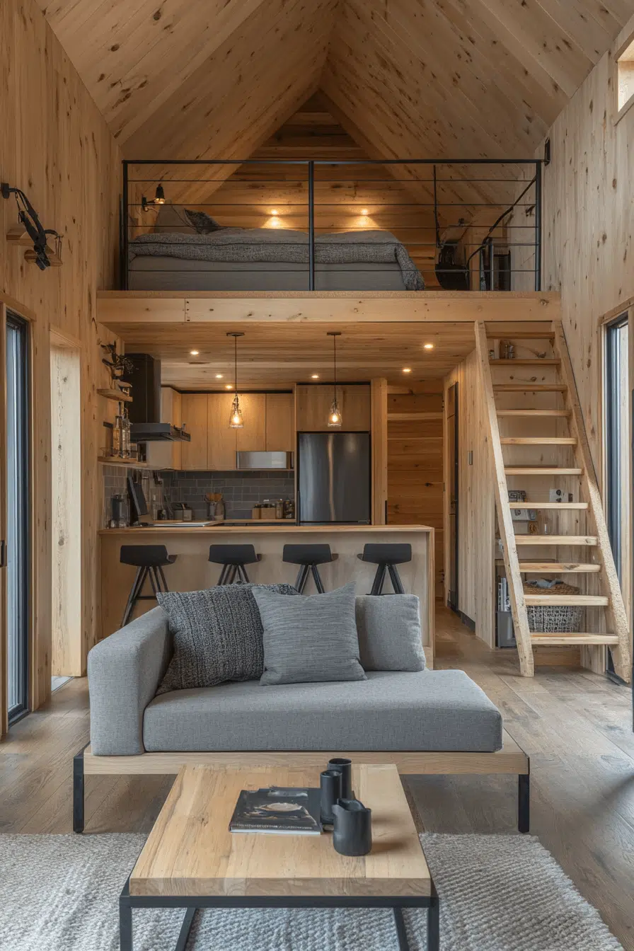 Loft-style bedrooms unlock valuable vertical space inside tiny cabins interiors, transforming unused height into a functional retreat. By lifting the bed, you free up the floor for lounging, dining, or creative work zones. Thoughtful details like built-in steps, ambient lighting, and integrated shelving make the loft feel intentional and safe. Warm wood finishes and plush bedding turn the elevated space into a cozy hideaway. This approach blends comfort with clever spatial planning. Explore loft bedroom inspiration that makes small cabins live larger!