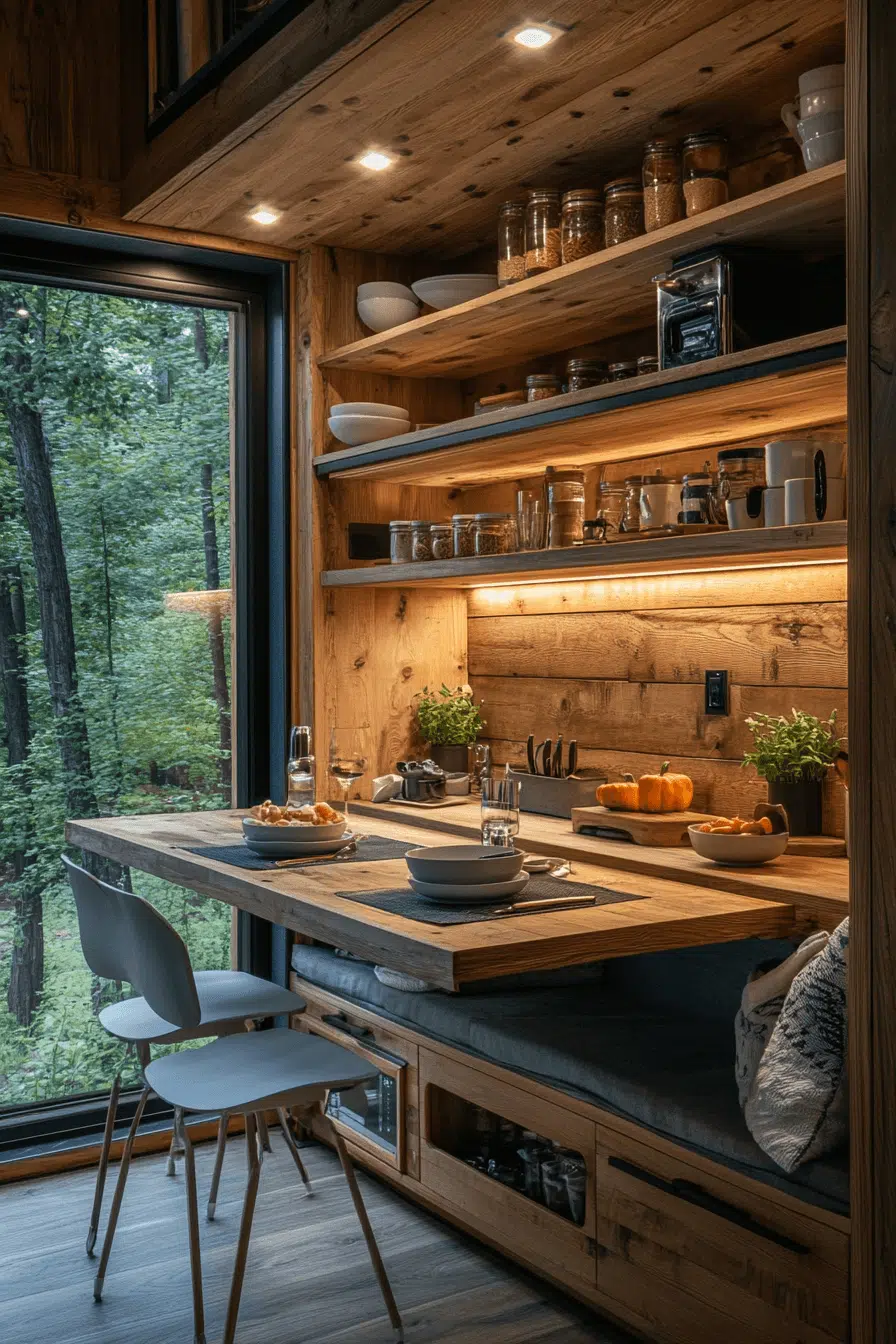Wall-mounted and foldable furniture keeps tiny cabins interiors adaptable and open. Pull-down desks and flip-up tables create instant flexibility. Clean designs ensure effortless transitions. Built-in storage adds extra value. The space works harder without feeling crowded. Explore furniture solutions designed for flexible tiny living!