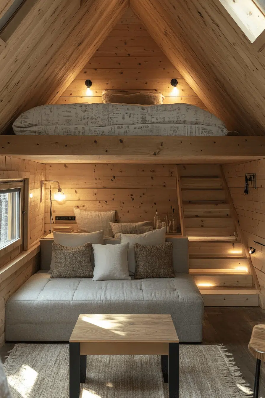 Sleeping lofts create privacy and charm within tiny cabins interiors while preserving floor space. Elevated designs feel adventurous and cozy. Skylights and railings keep the loft airy and safe. Compact beds enhance comfort. It’s a smart vertical solution. Explore loft sleeping ideas that maximize height beautifully!