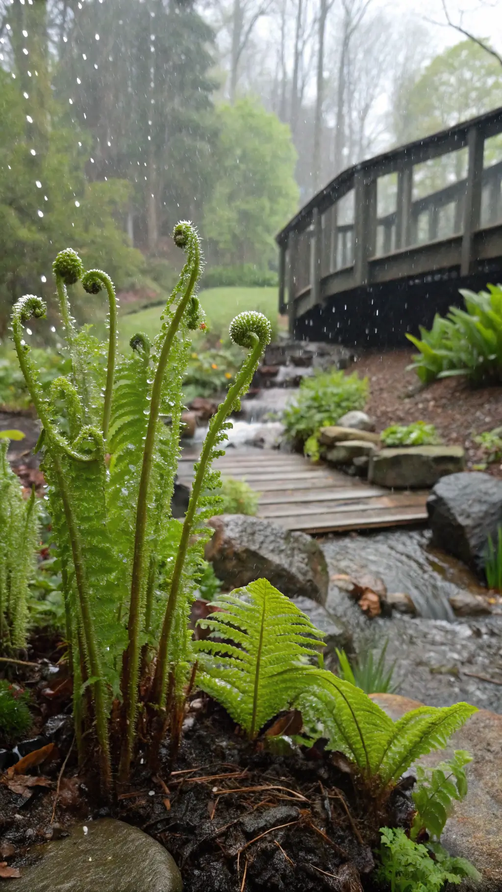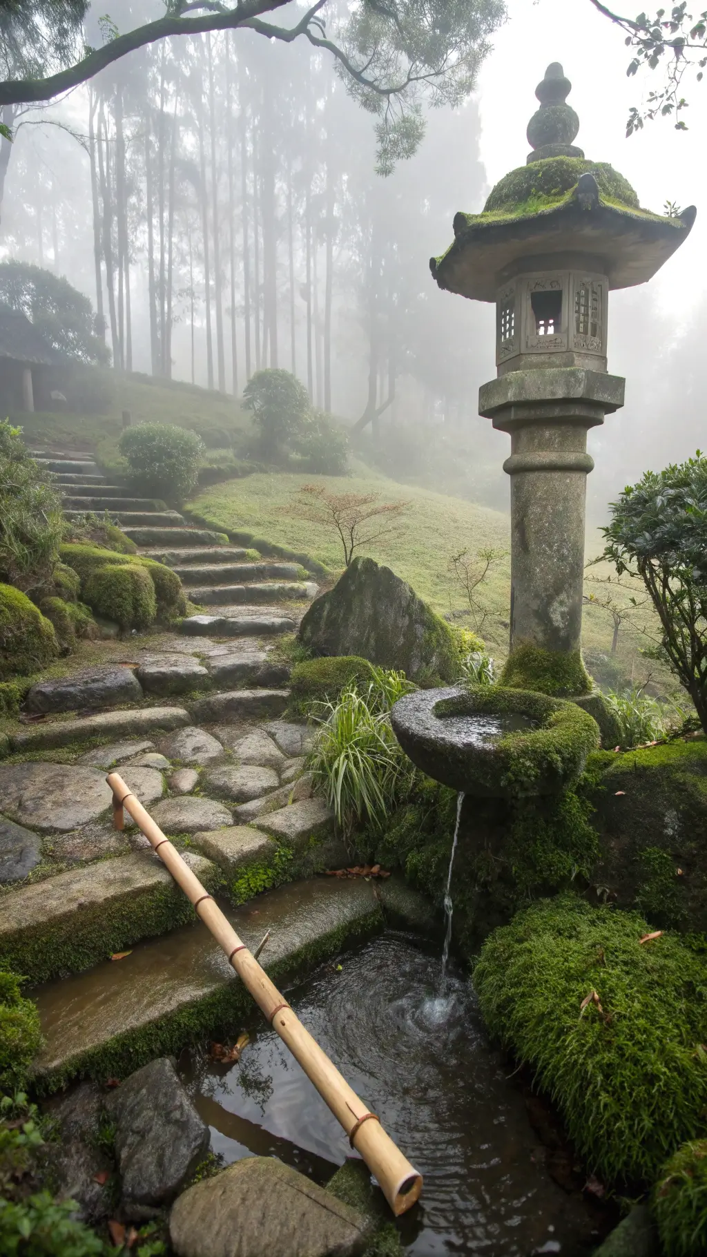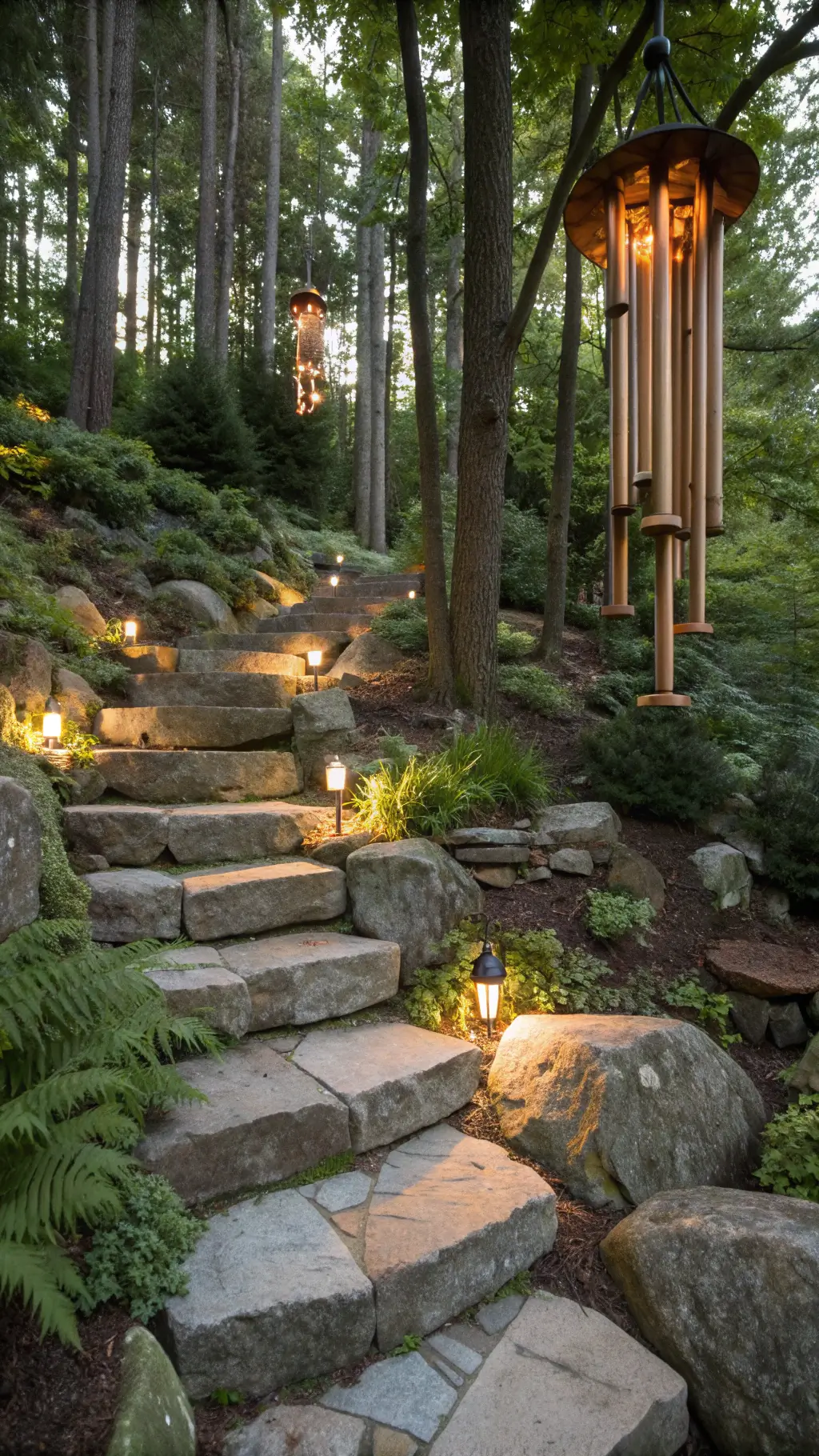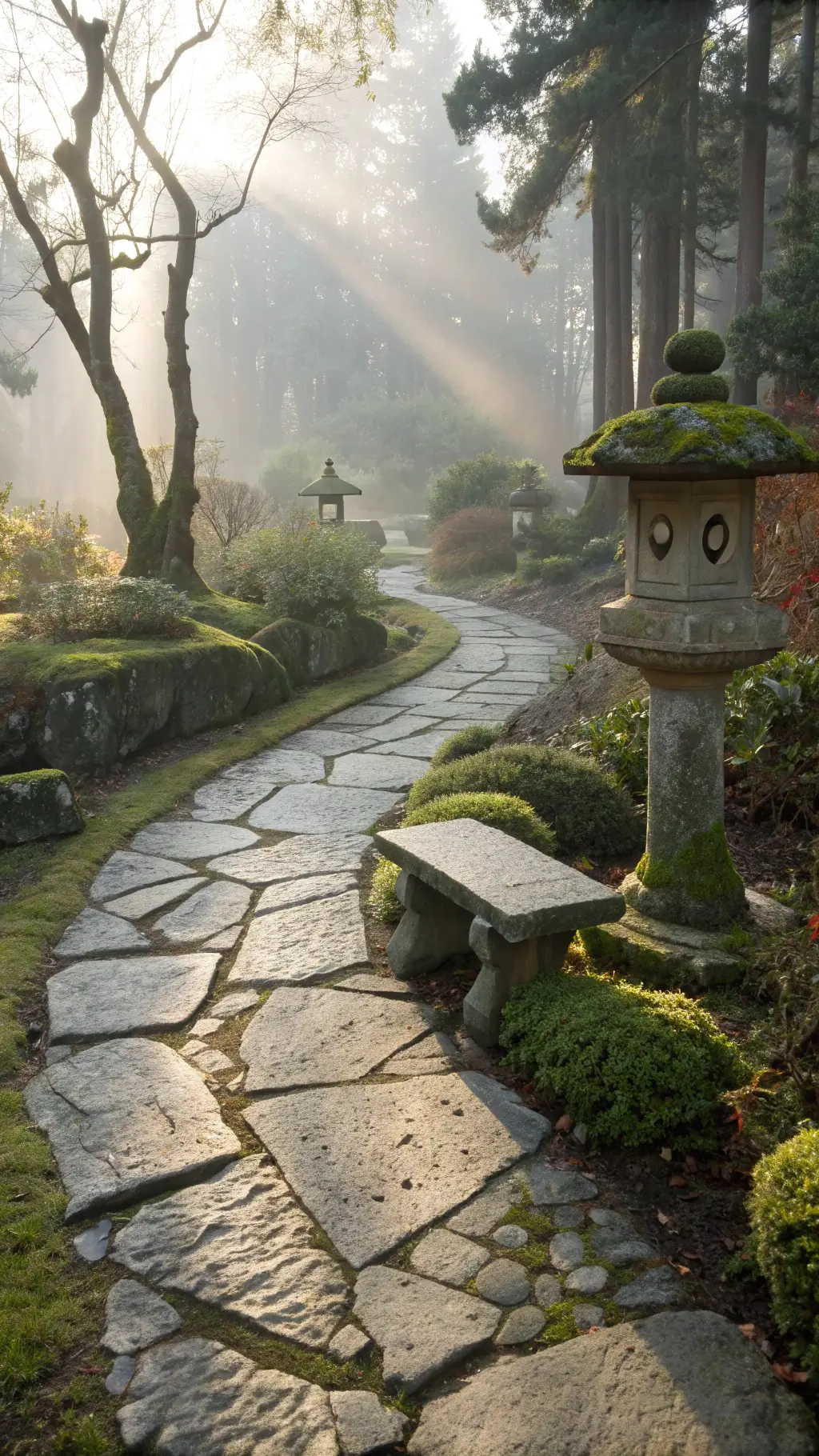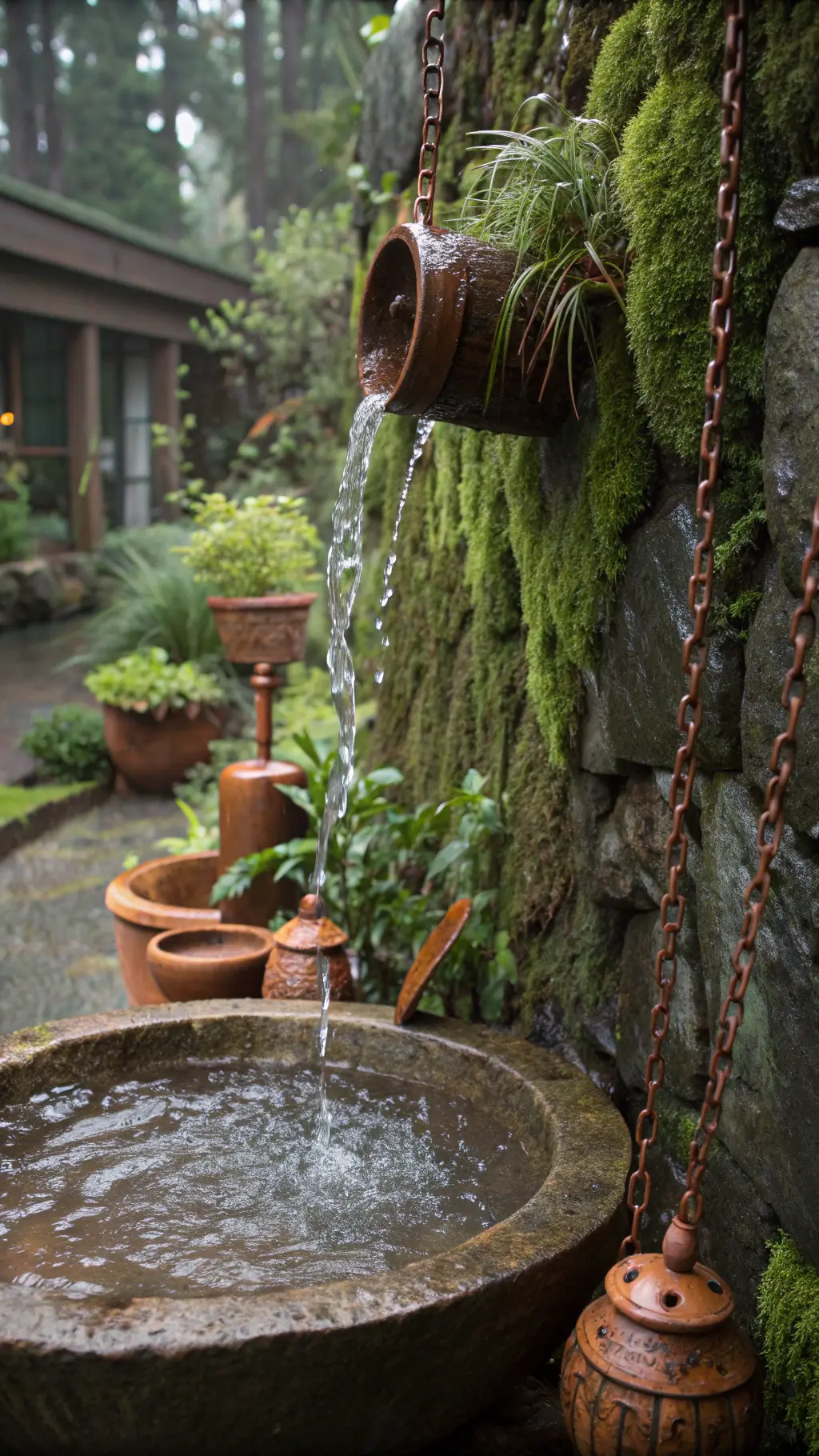 - Natural materials: stone, weathered wood, moss