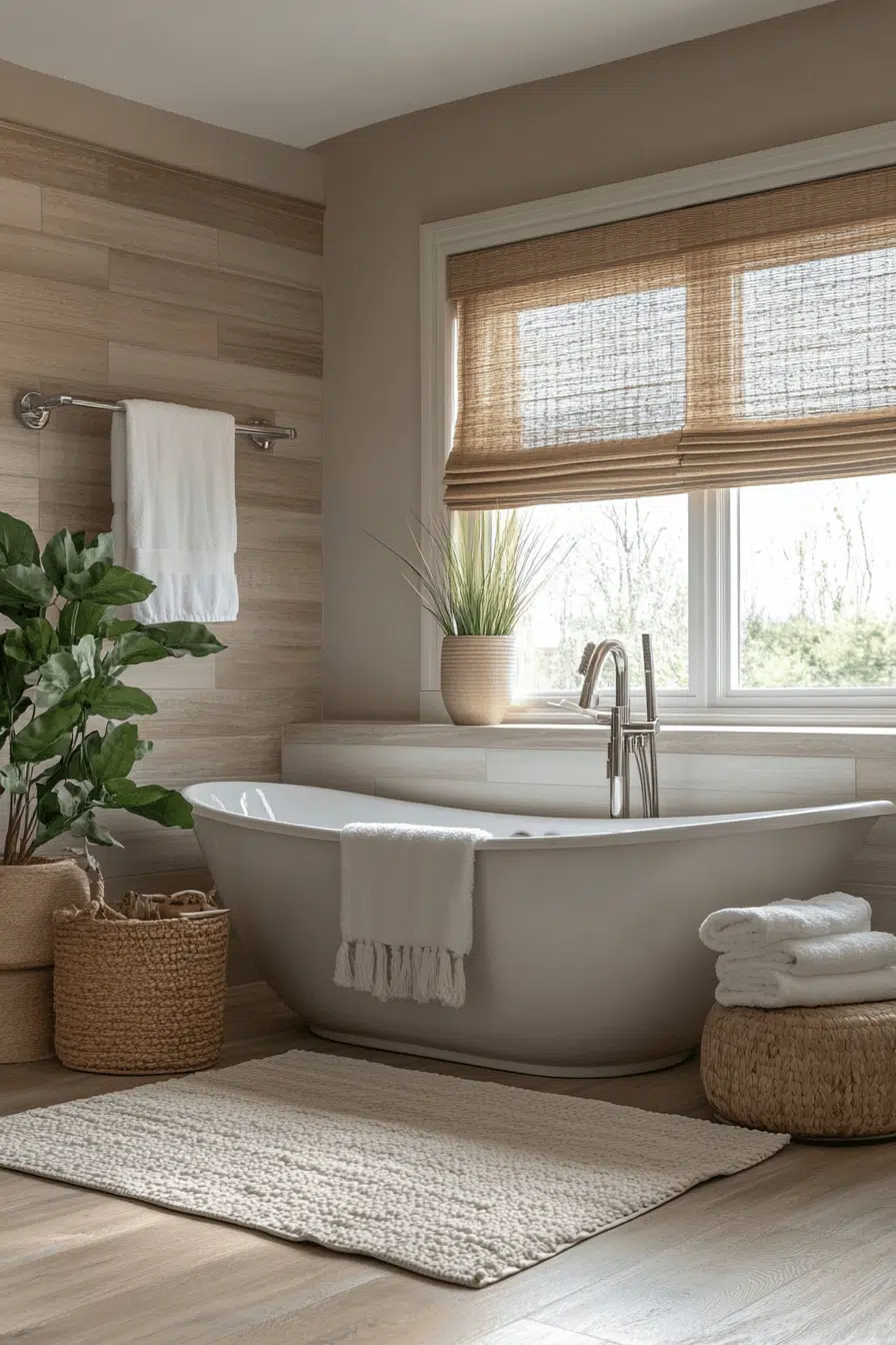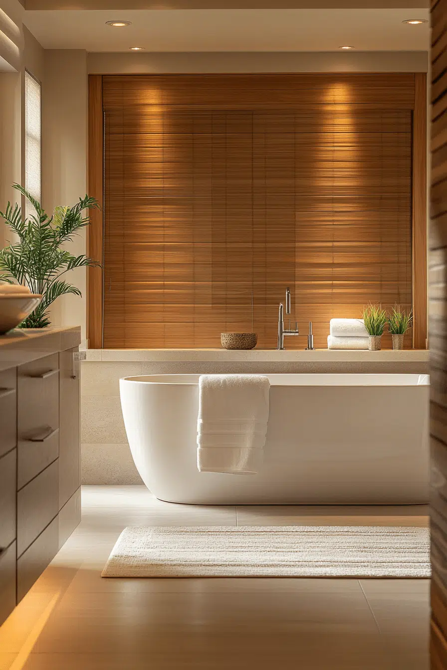 Wood slat details introduce texture while preserving calm in modern zen bathroom decor ideas. Vertical or horizontal slats add warmth and structure. Their natural grain enhances connection to nature. These accents add depth without clutter. The look feels earthy and balanced. Explore more zen bathroom decor ideas featuring wooden slat elements.