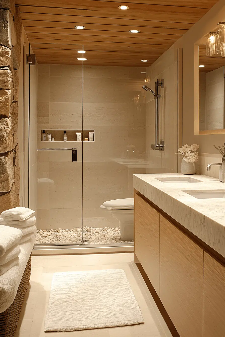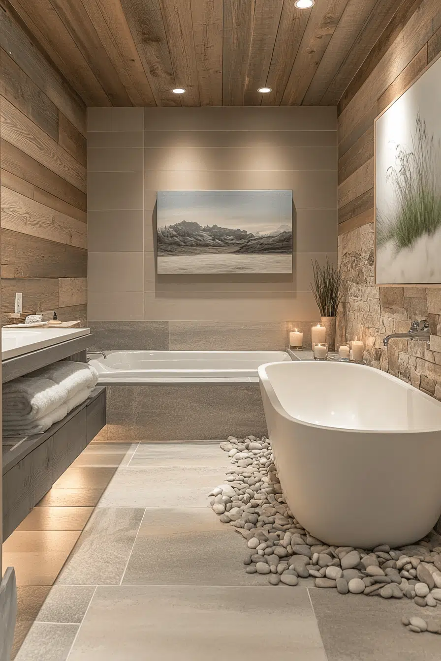 Combining cool stone with warm wood creates effortless balance within zen bathroom decor ideas. Stone countertops and wooden vanities contrast without visual tension. The textures invite both touch and quiet appreciation. This pairing feels organic and naturally cohesive. The bathroom remains grounded yet refined. Discover more zen bathroom decor ideas featuring stone and wood harmony.