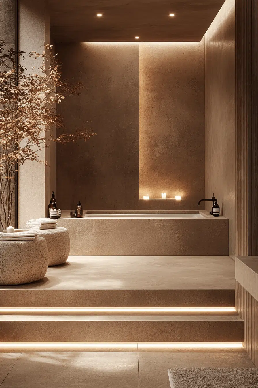 Earth-toned palettes bring warmth and comfort to inviting zen bathroom decor ideas. Colors like terracotta, sandy beige, and soft brown add emotional depth. Natural stone and wood finishes reinforce a grounded atmosphere. Gentle lighting enhances the cozy feel without overwhelming the space. The bathroom becomes a personal retreat. Discover more zen bathroom decor ideas inspired by warm, earthy tones.