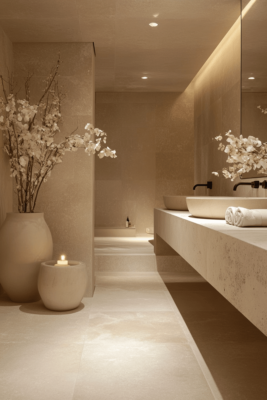 A palette of soft neutrals forms the backbone of elegant zen bathroom decor ideas. Shades like ivory, pale gray, and sandy beige diffuse light and soften the environment. These colors reduce visual noise while allowing textures to subtly shine. Wood and stone accents introduce warmth without overpowering the calm. The result feels cohesive and intentional. Explore more zen bathroom decor ideas rooted in calming neutral tones.